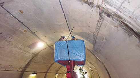 「NTRフォーム工法」は、導水路や道路・鉄道トンネルの背面に長年の流水により洗堀された空洞が発生している事例が多く、この空洞に硬質発泡ウレタンを発泡充填して覆工壁への衝撃や周辺地山からの応力の分散を図る工法です。気泡モルタルや可塑モルなどよりも極めて軽量で覆工への影響が小さく、また注入材の運搬も発泡倍率に応じてかなり縮減出来、作業性も良好なため、近年は補修ニーズが増えています。